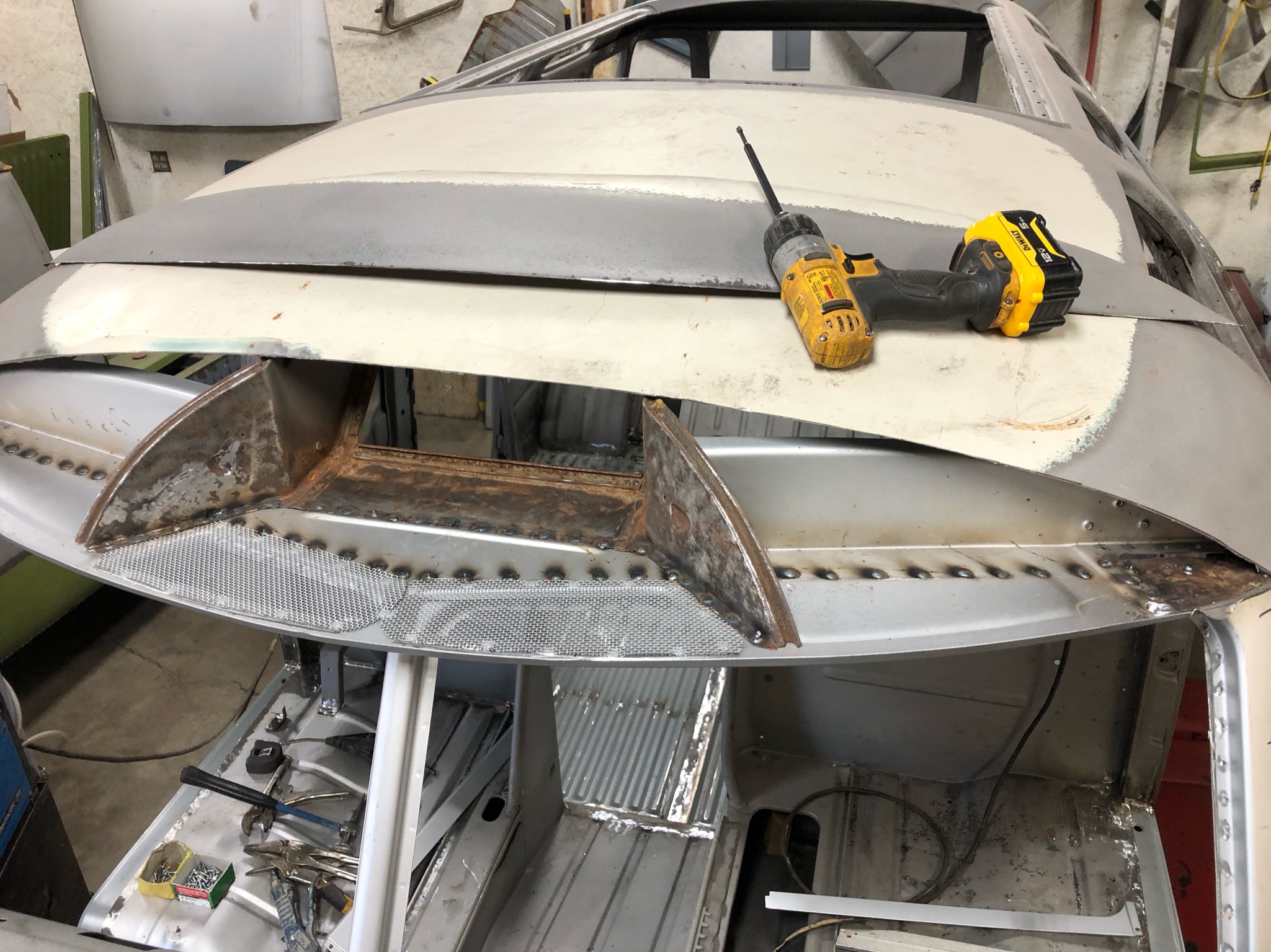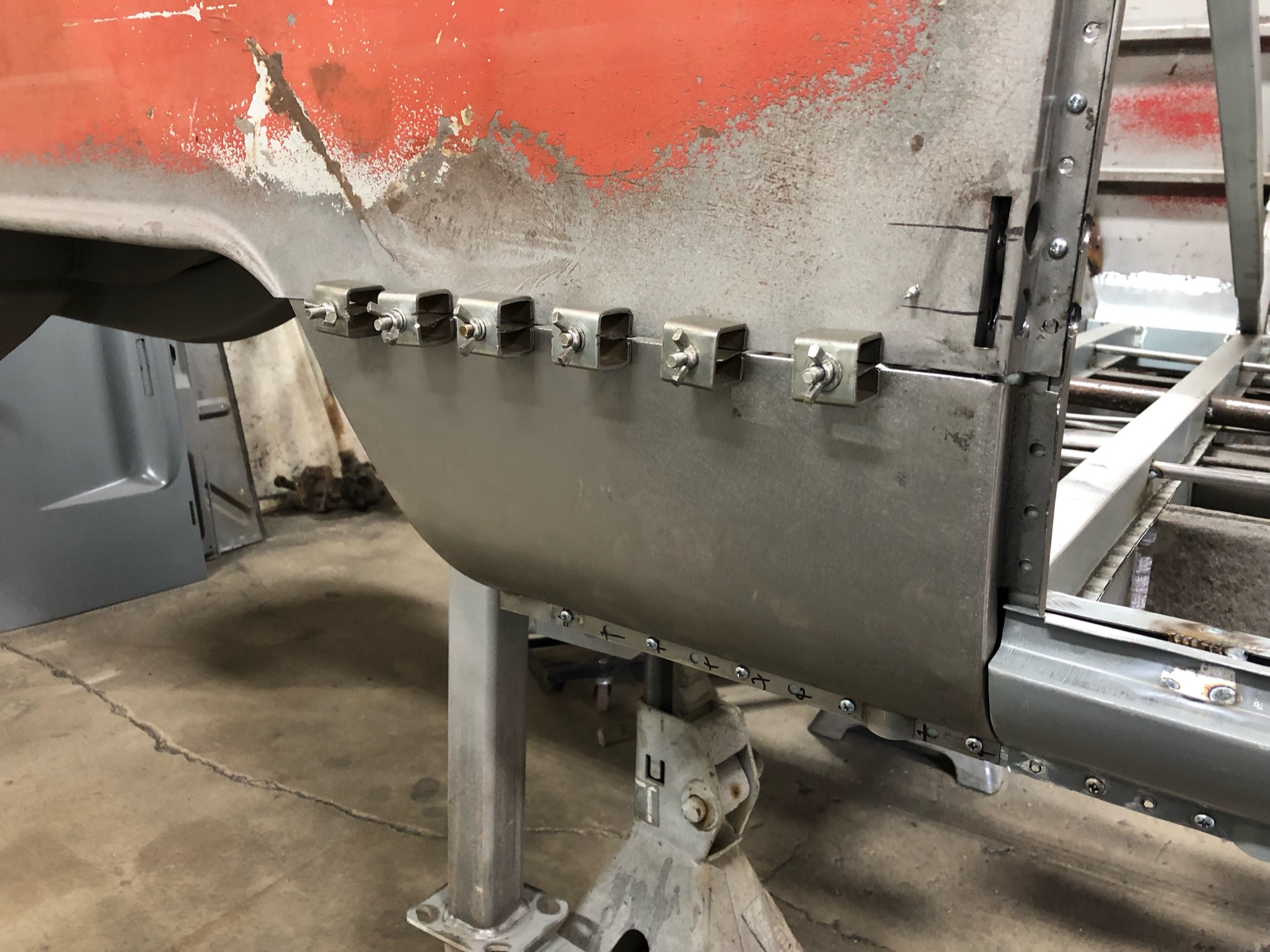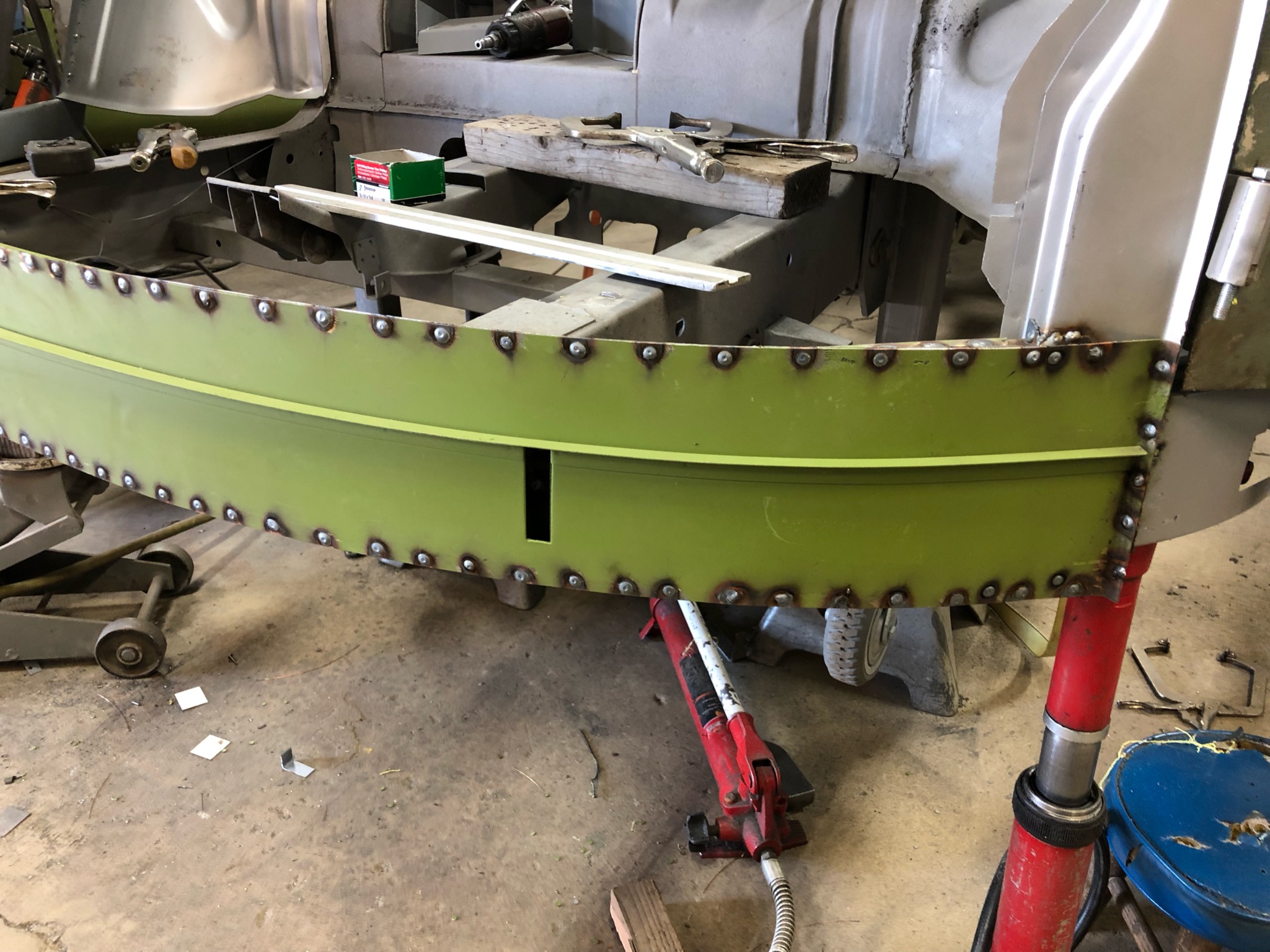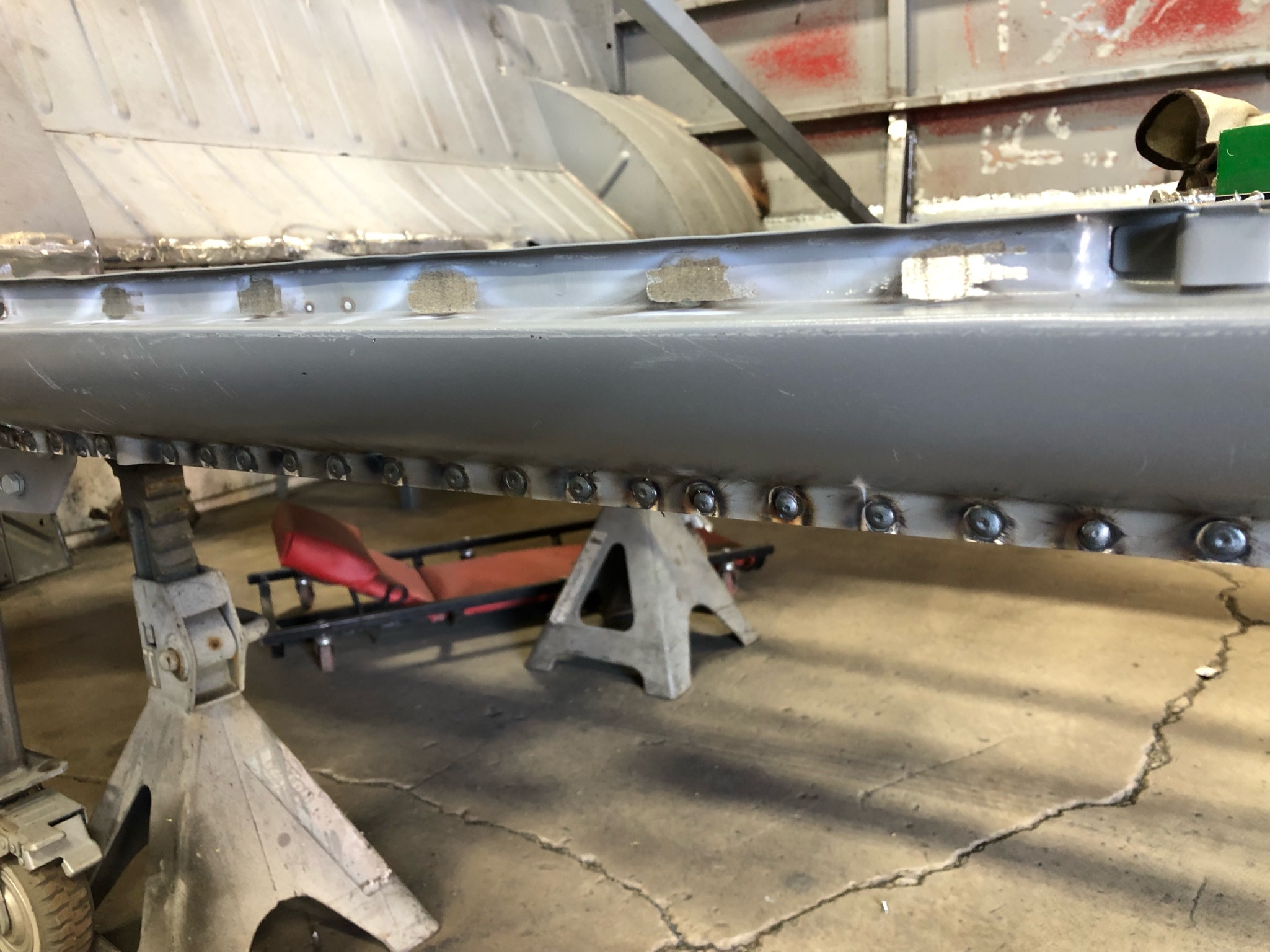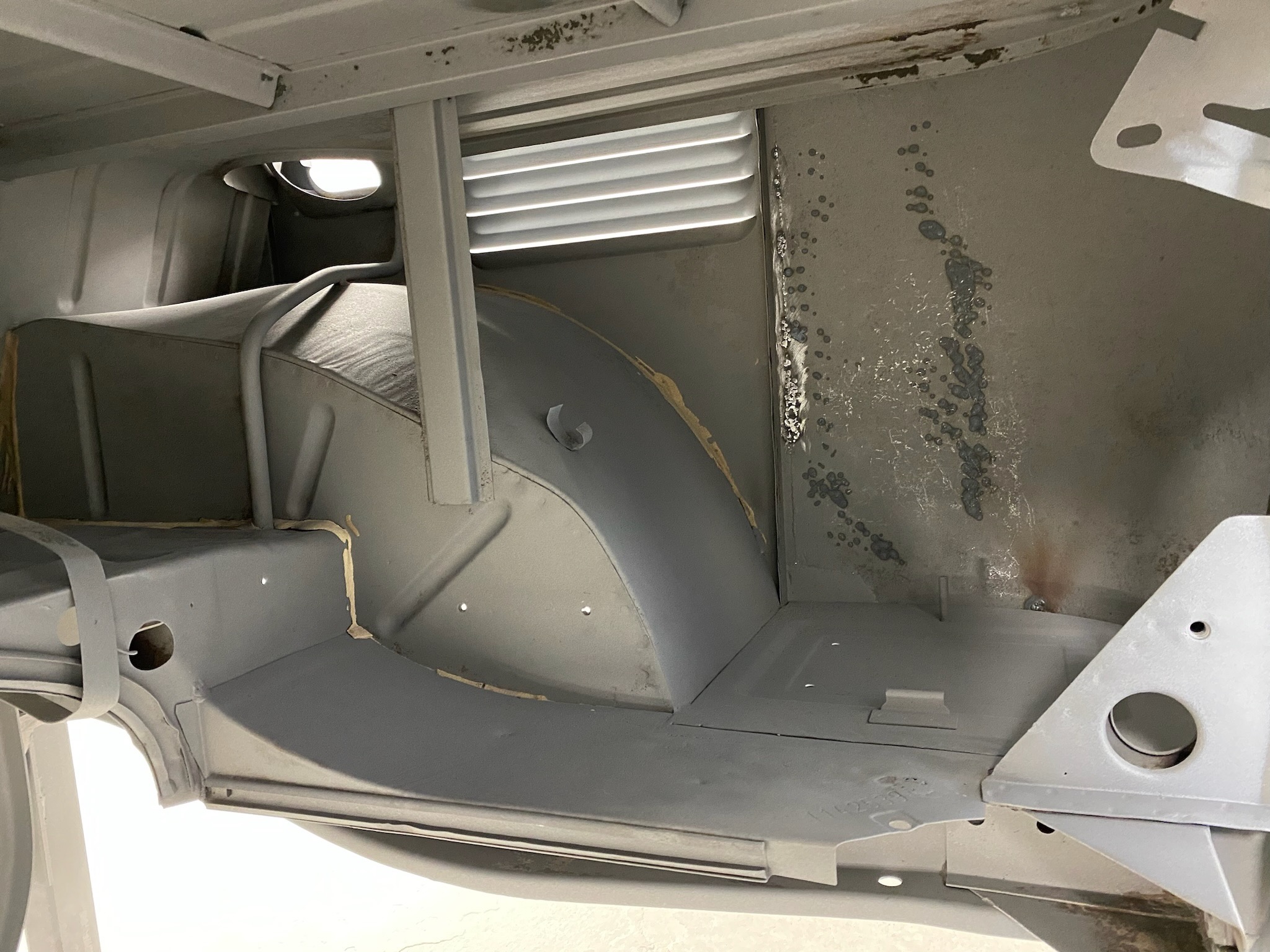 Rust repair on driver’s side door, belly pan prep, and misc floor work.