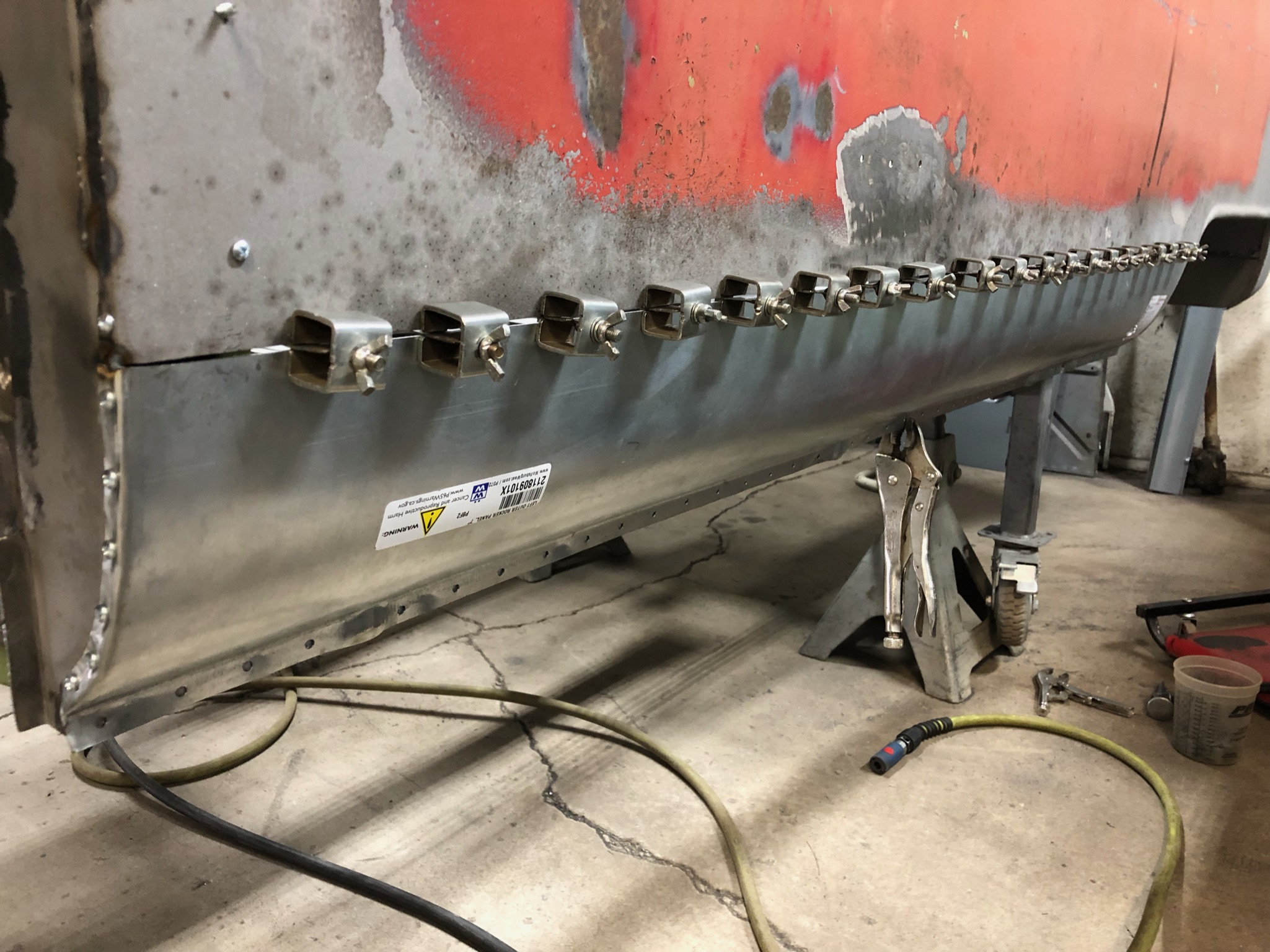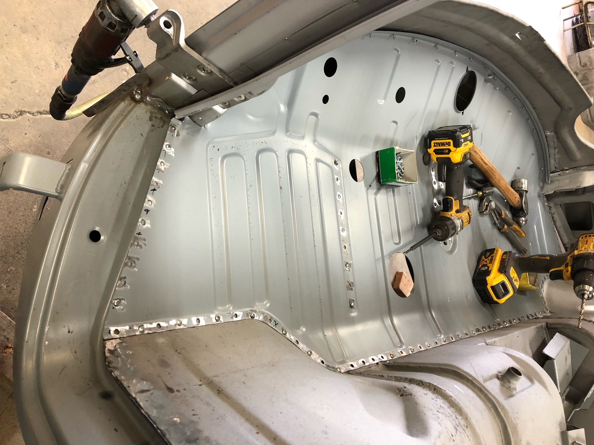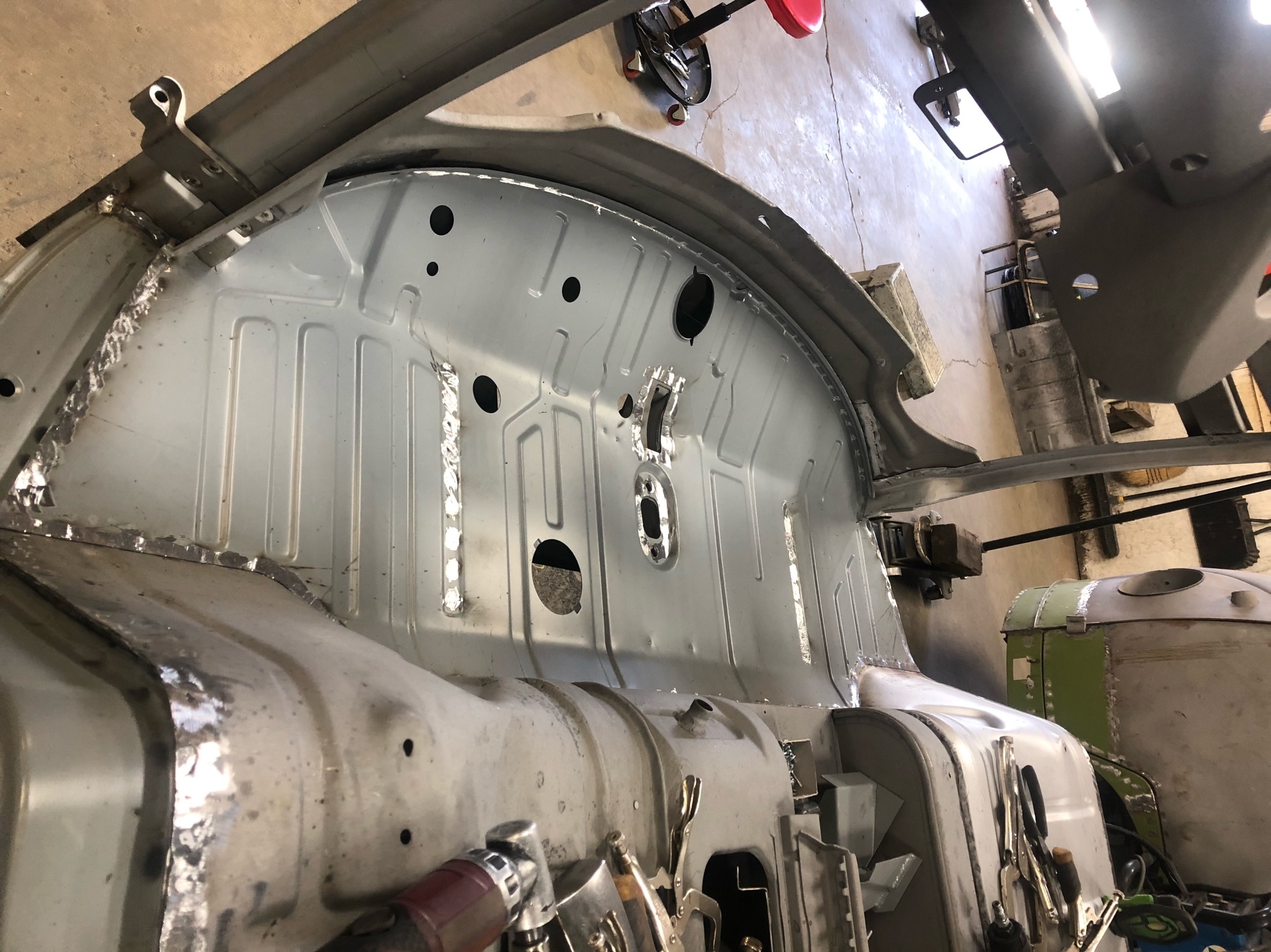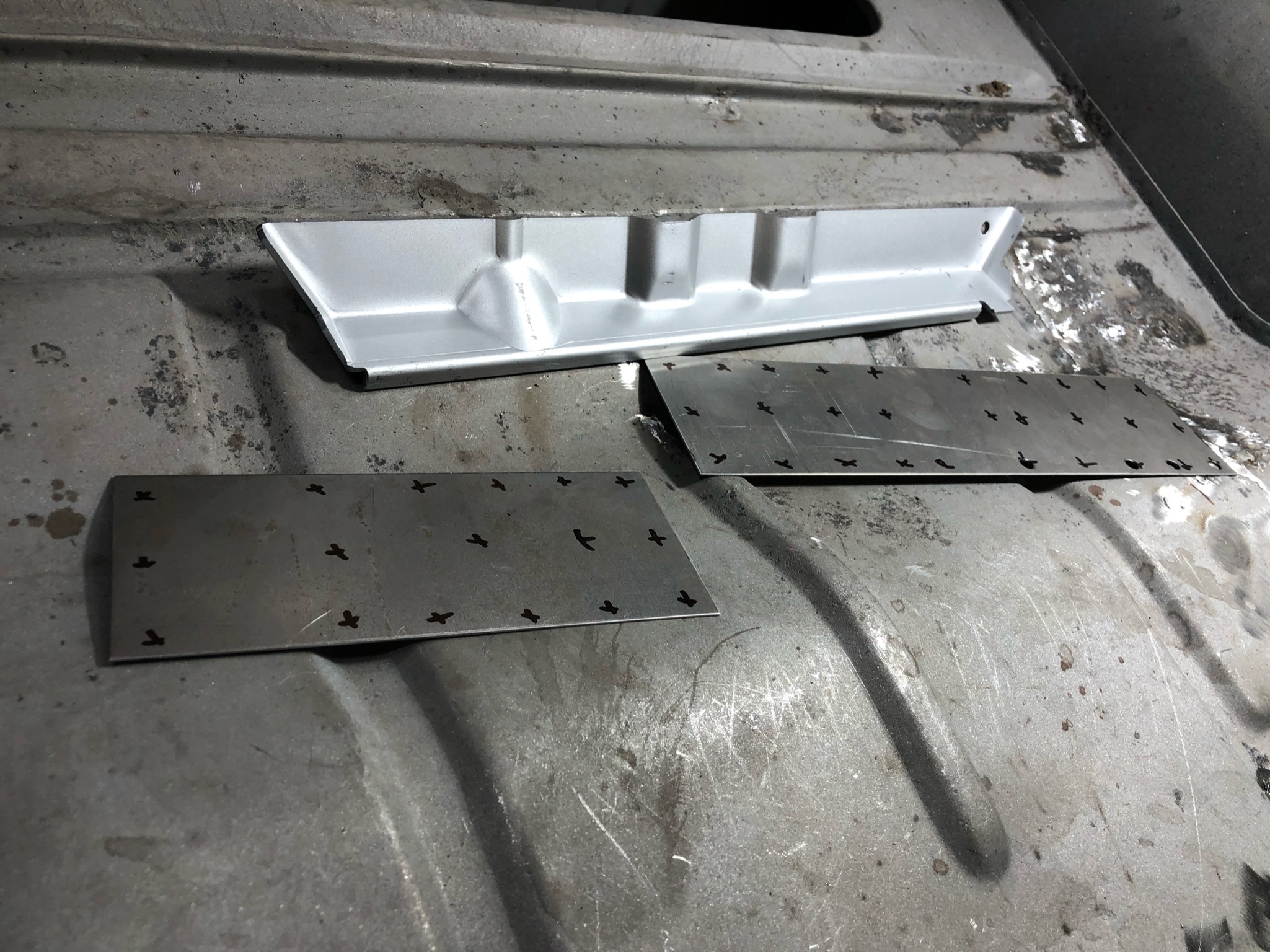 Rust repair on driver’s side door, belly pan prep, and misc floor work.