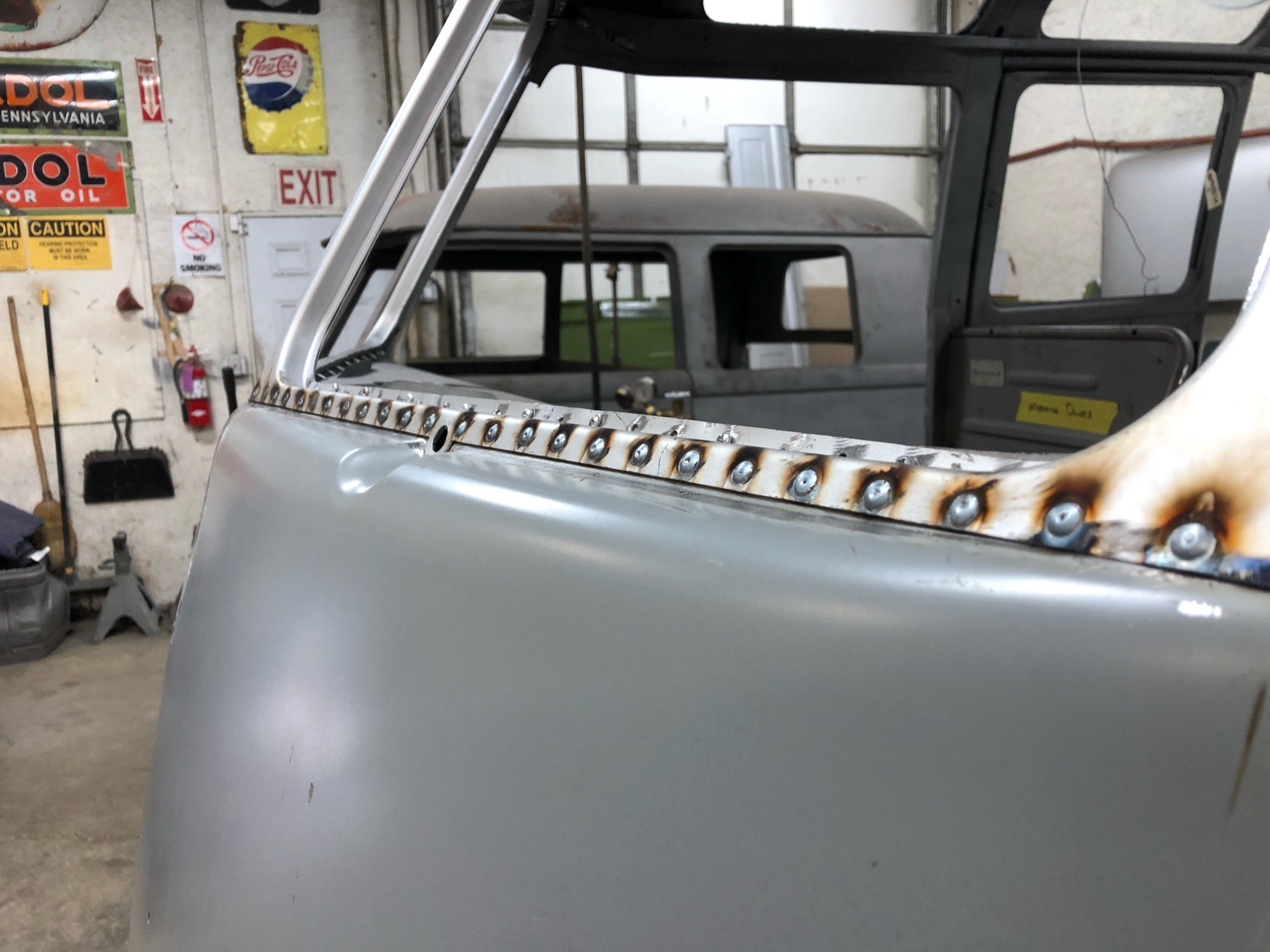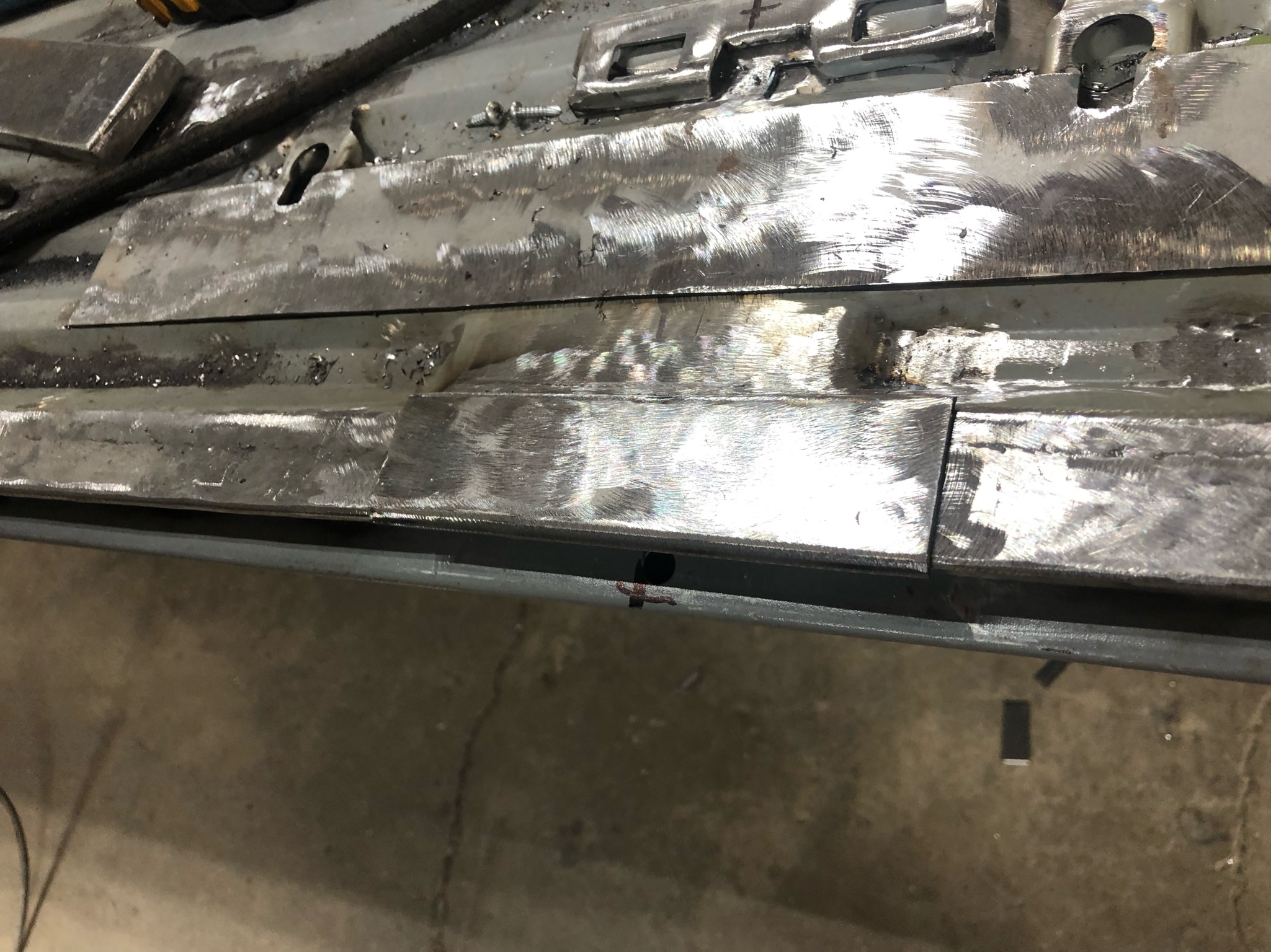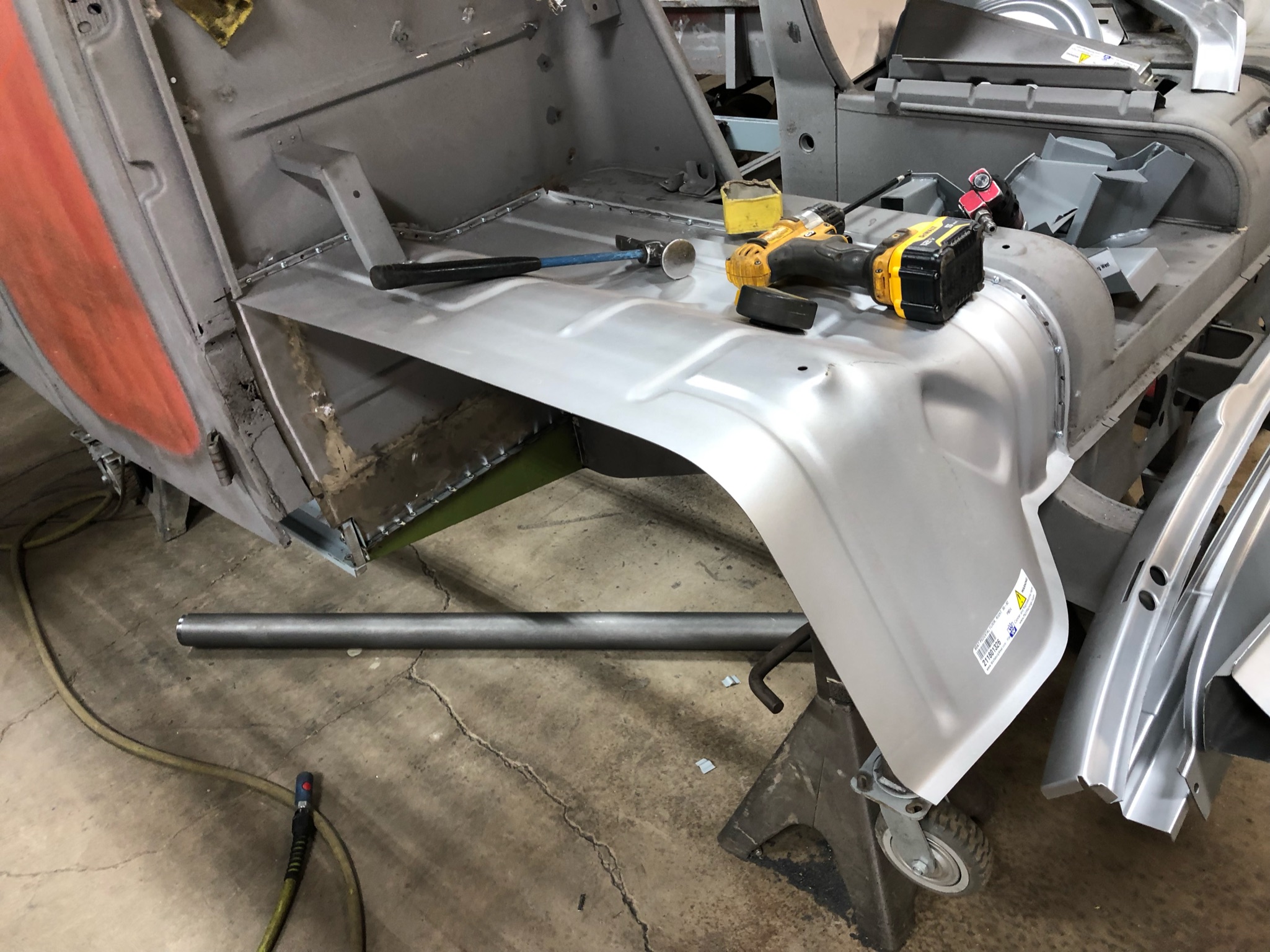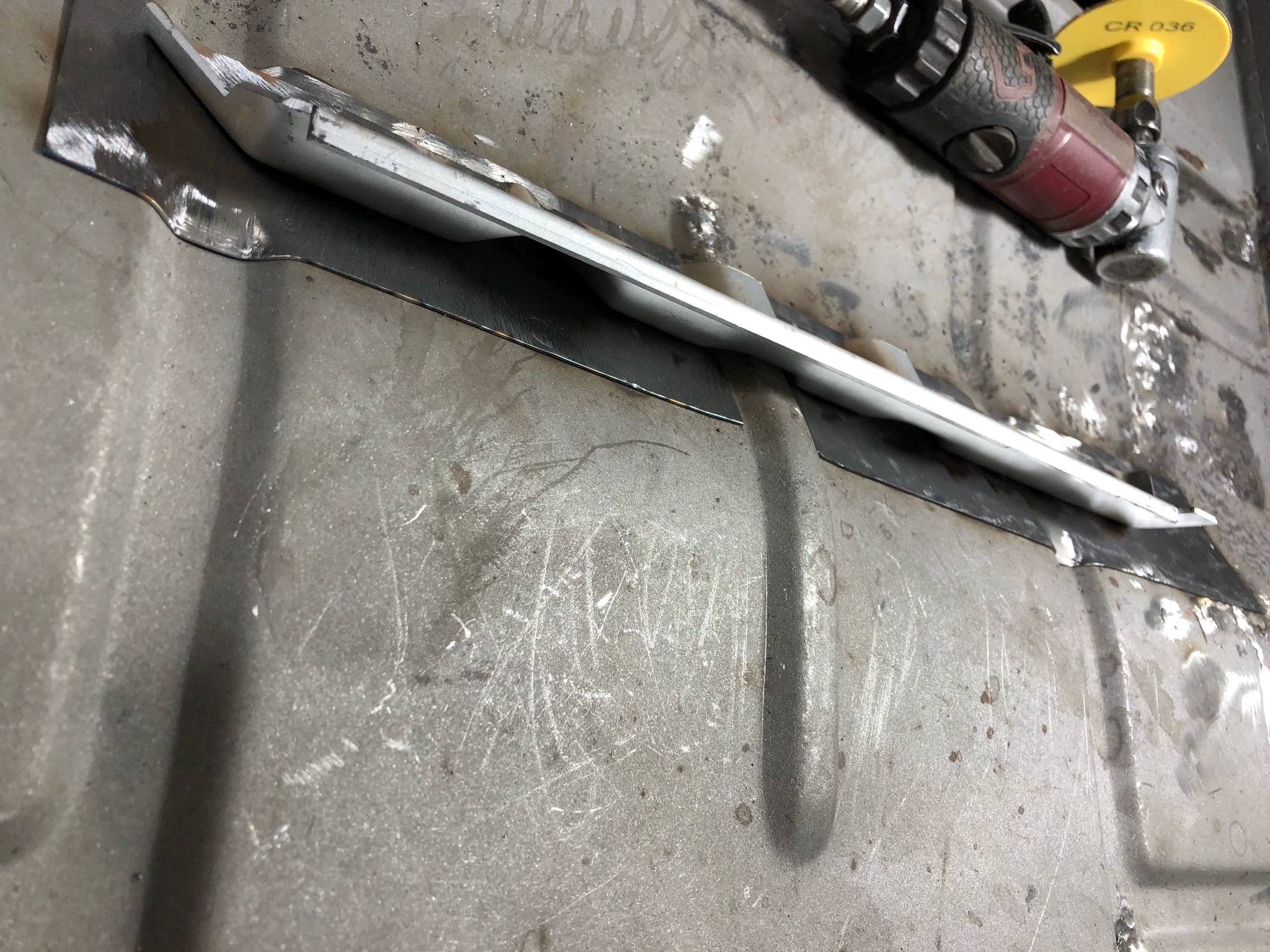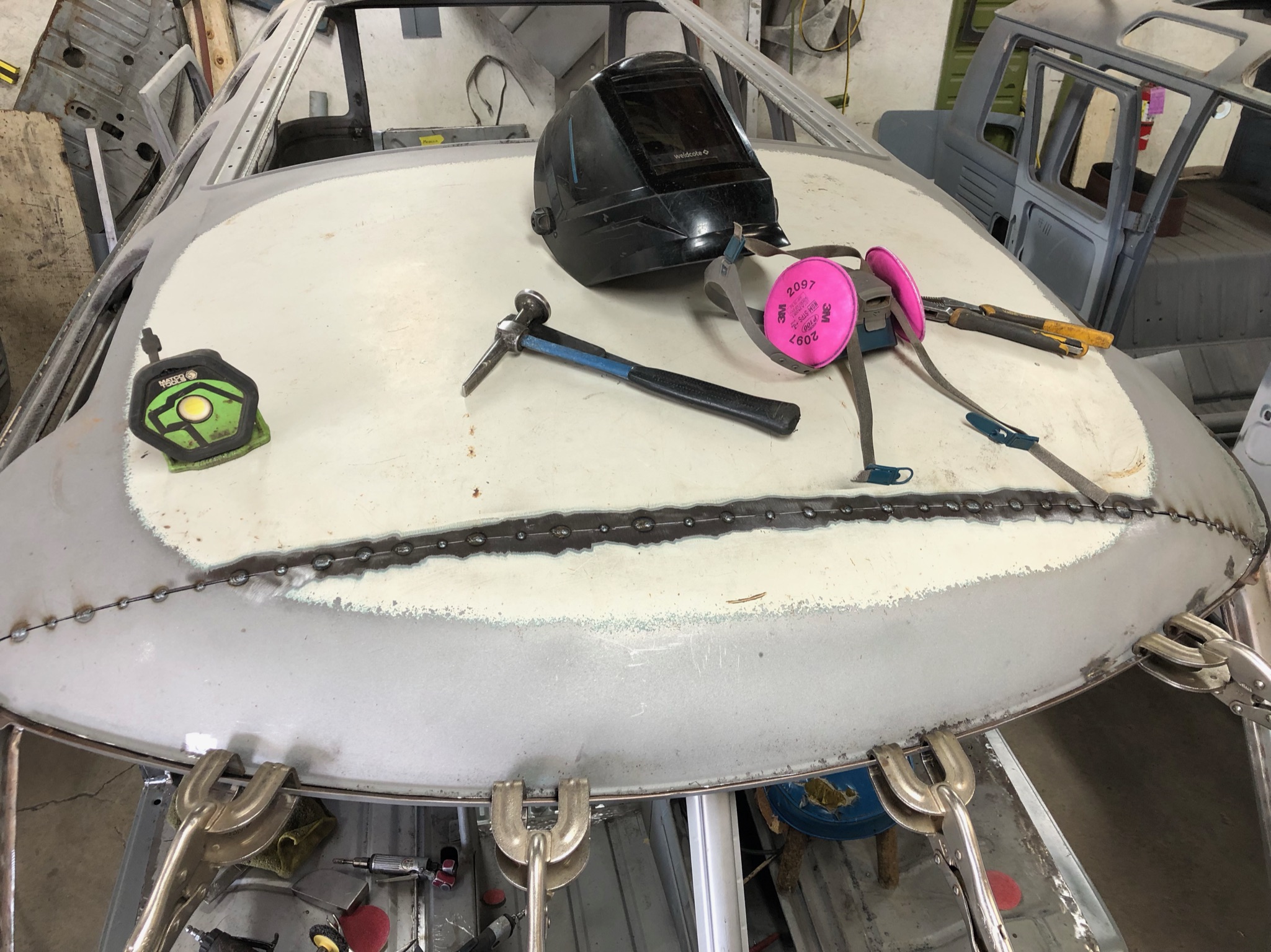 Rust repair on driver’s side door, belly pan prep, and misc floor work.