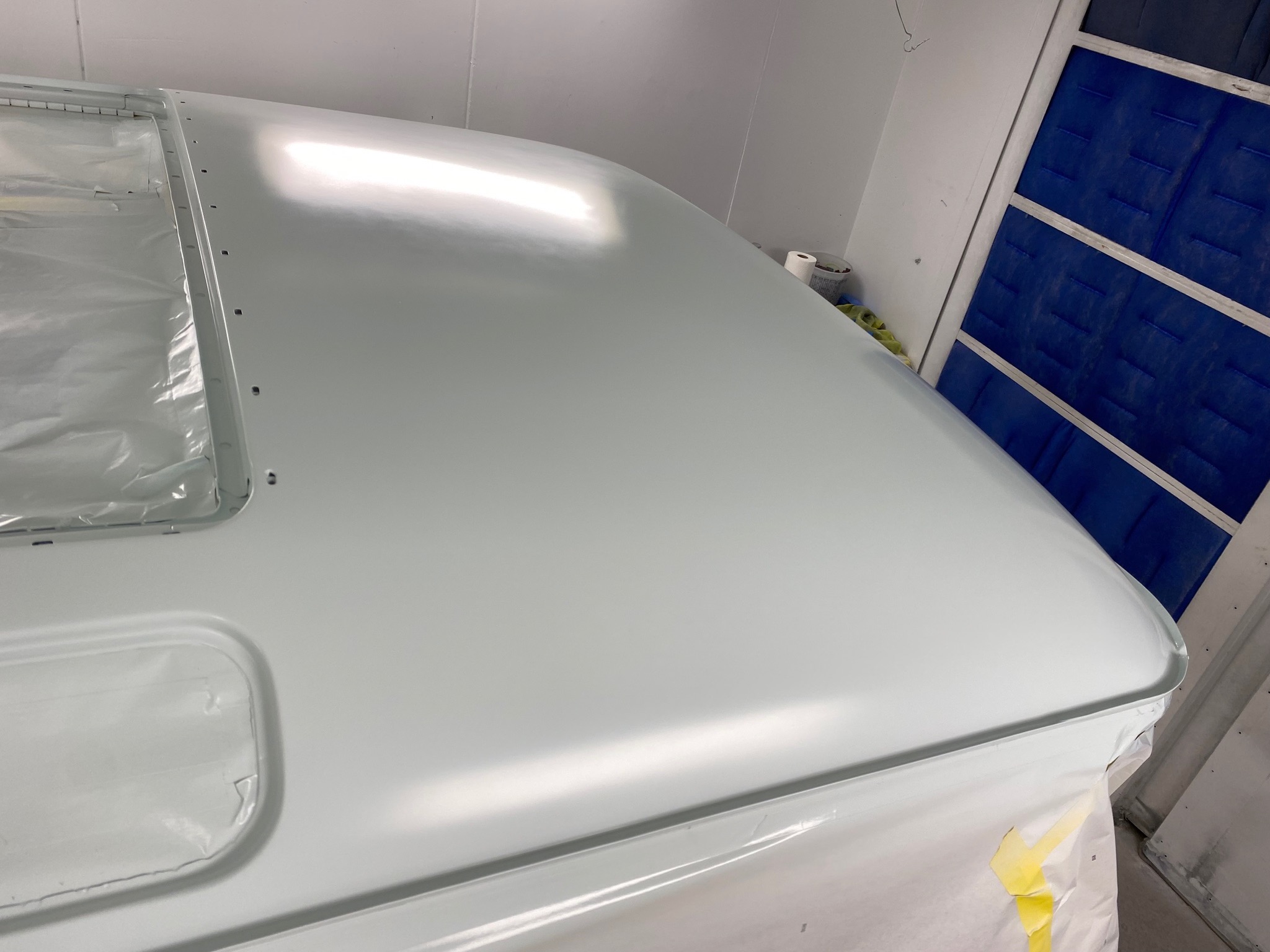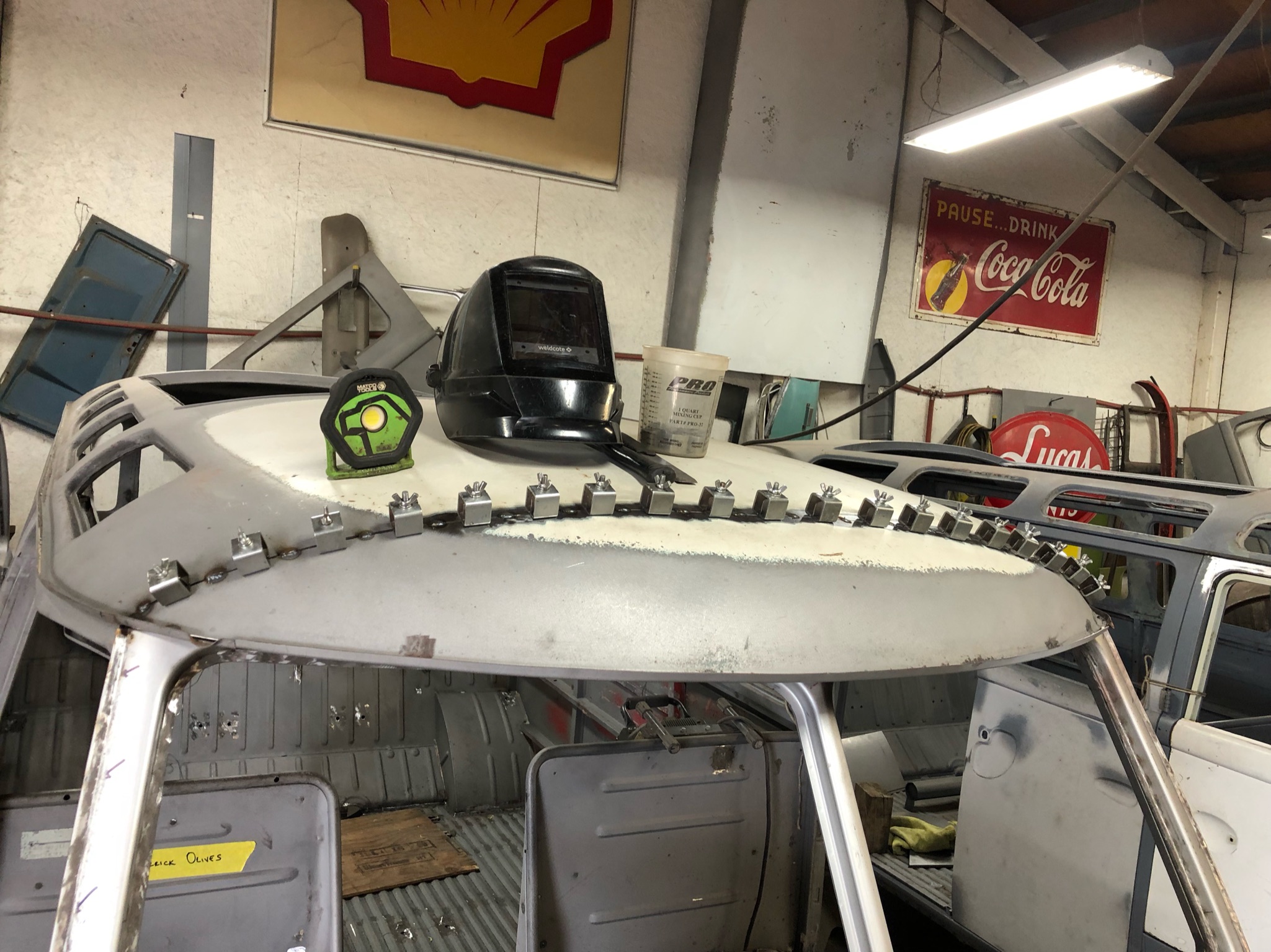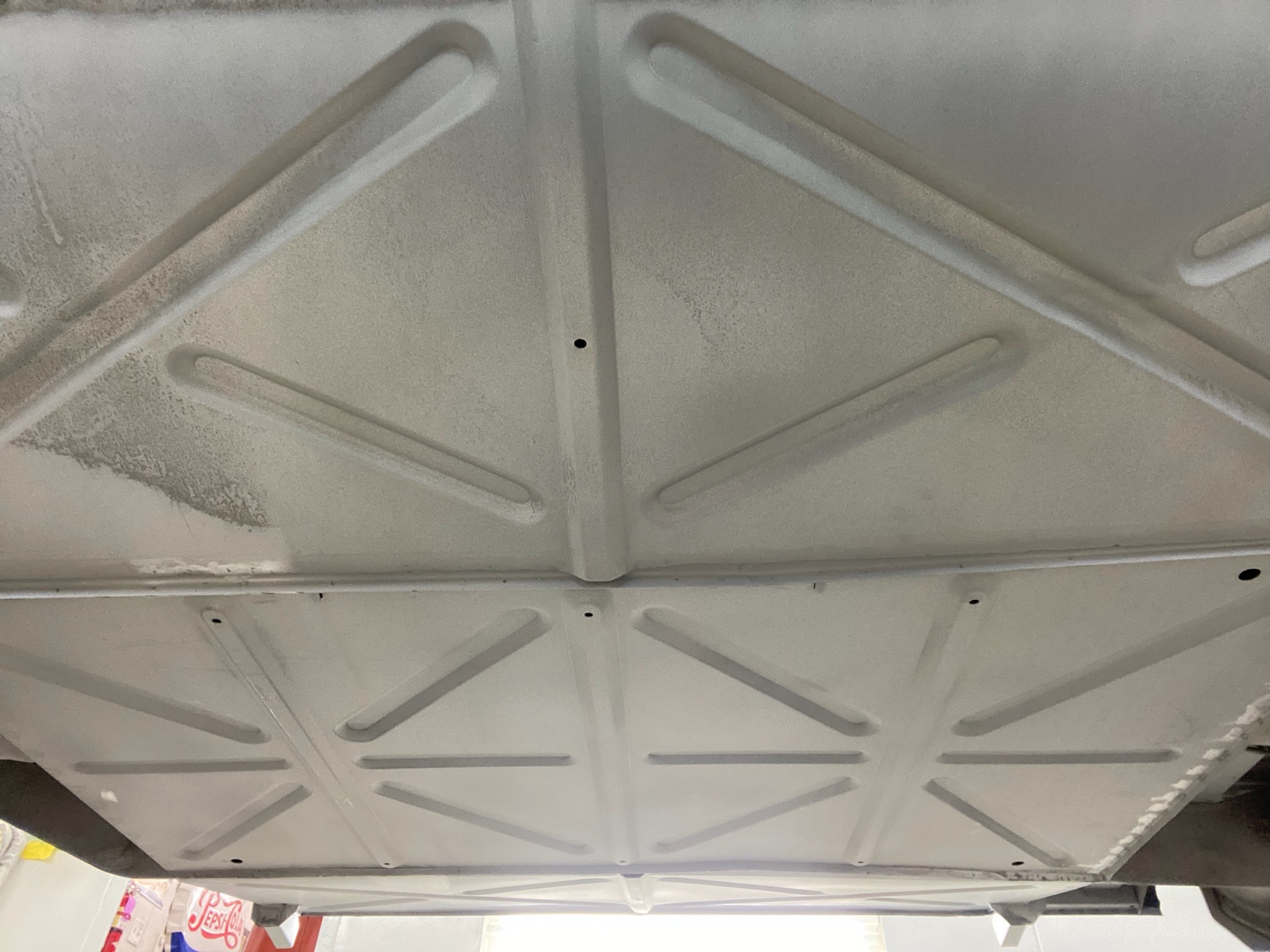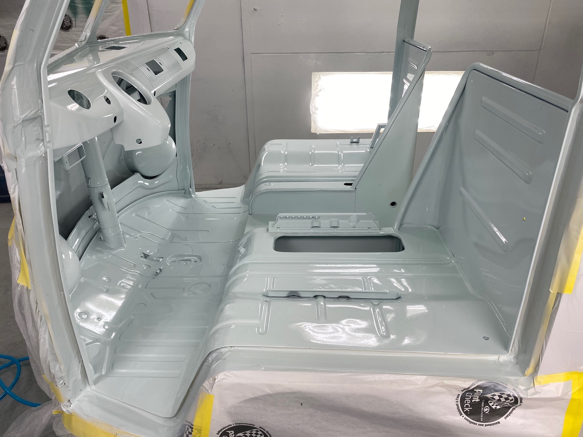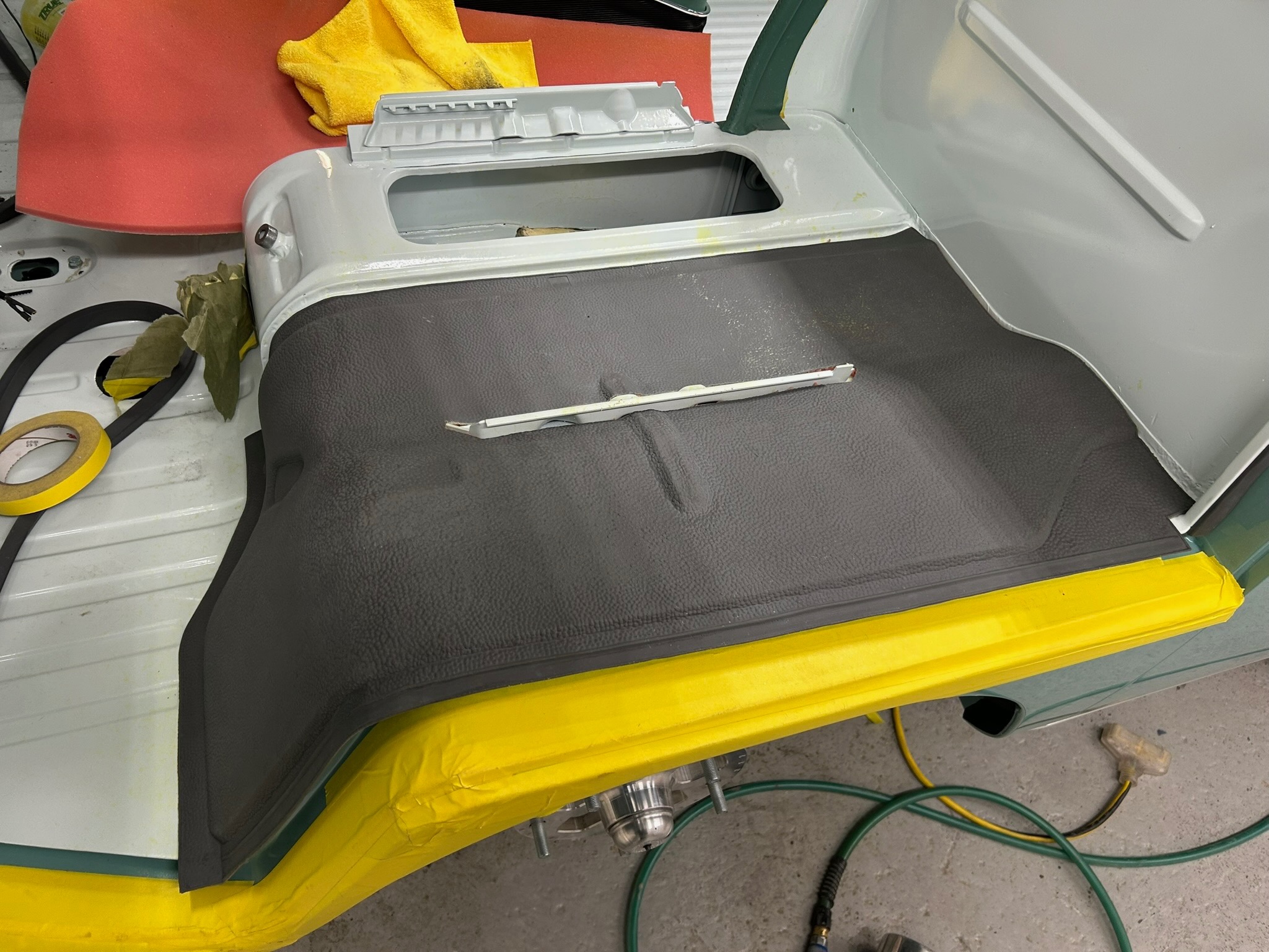 Rust repair on driver’s side door, belly pan prep, and misc floor work.